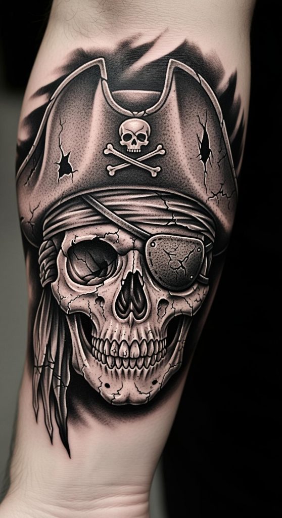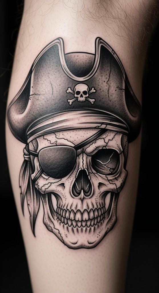 This striking tattoo brings together the fierce symbolism of the skull with the rebellious spirit of the pirate, embodying themes of fearlessness, independence, and the relentless pursuit of one’s own path. The skull, adorned with a classic pirate hat, eyepatch, and bandana, nods to a legacy of defiance against the rules and an unwavering acceptance of risk—qualities celebrated in tales of adventurers and outlaws alike.
