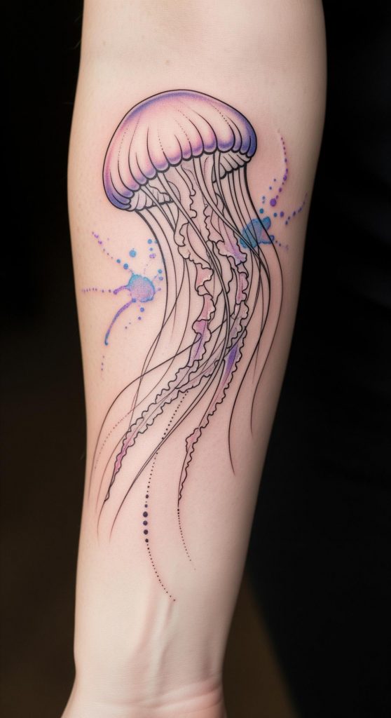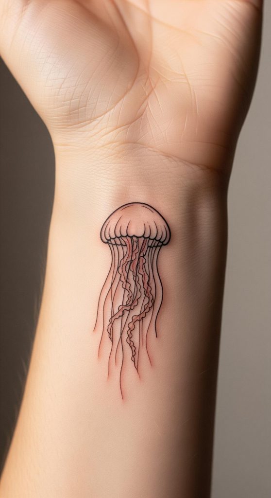 This delicate jellyfish tattoo embodies the poetic balance between vulnerability and inner strength, drawing from the profound symbolism of adaptability and flow. Revered across many cultures as a creature of grace and mysterious resilience, the jellyfish teaches us to move gracefully through the tides of life, embracing change with courage and sensitivity.