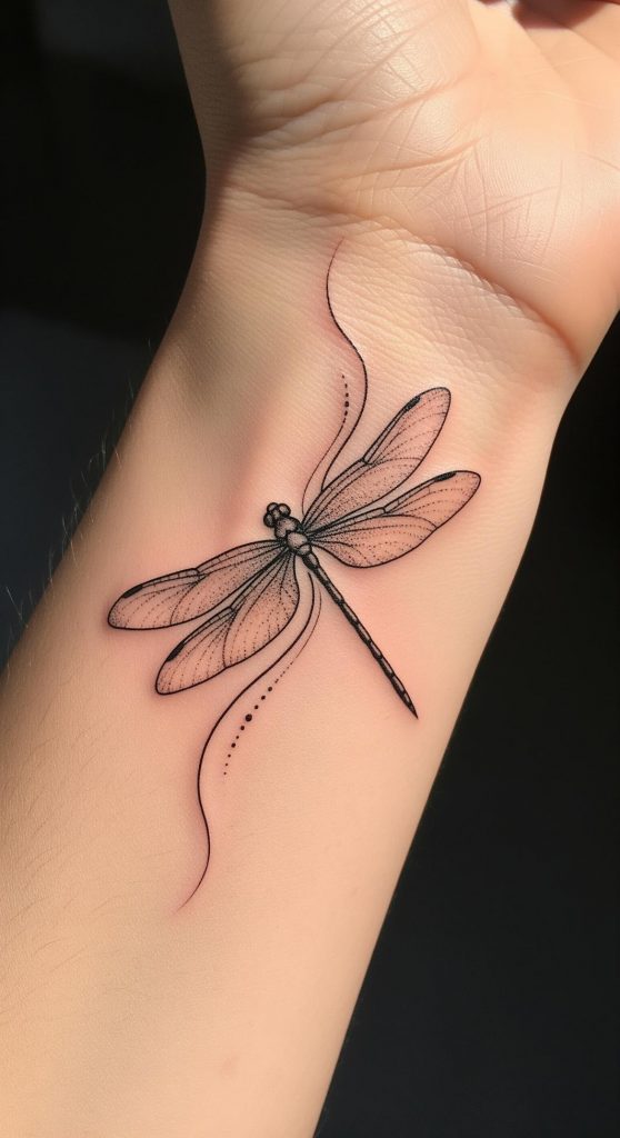 This delicate dragonfly tattoo radiates a sense of lightness and freedom, embodying transformation and adaptability at its core. Traditionally, the dragonfly is revered in various cultures as a symbol of self-realization, signifying the power to navigate life’s shifts with grace.