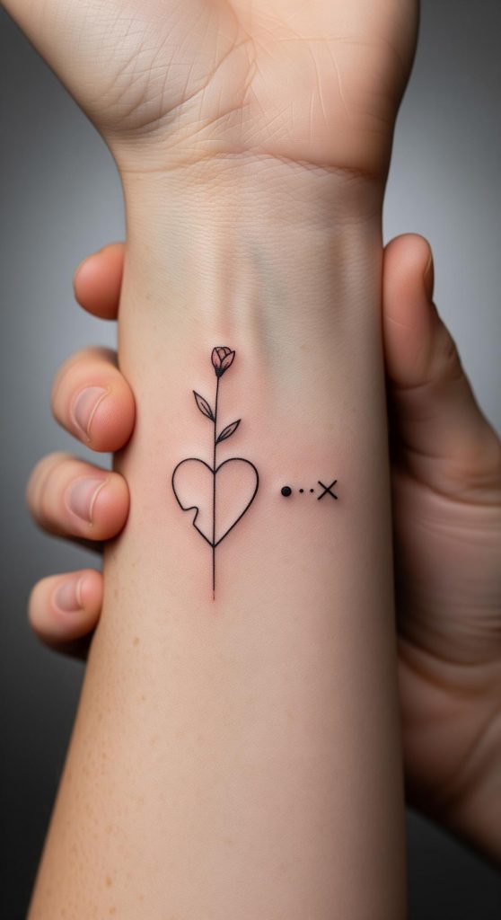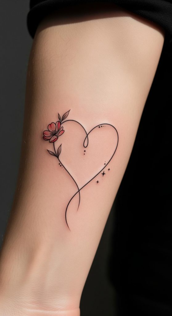 This delicate tattoo captures the poetic union of love and growth, symbolized through a minimalist heart seamlessly intertwined with a petite budding flower. The heart, open and softly sketched, stands as a universal emblem of affection and emotional depth, while the subtle floral accent conveys themes of new beginnings and resilience.