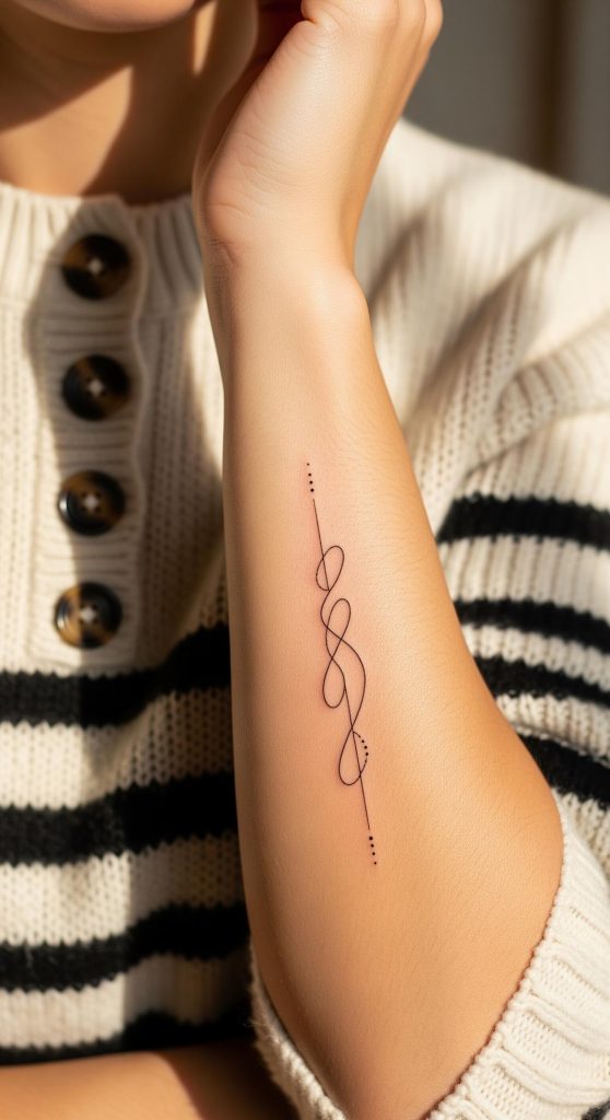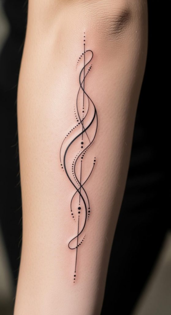 This delicate tattoo embodies the essence of refined minimalism, symbolizing both inner growth and the journey toward self-discovery. Its flowing, singular line and subtle abstract flourishes evoke a sense of effortless grace, reminiscent of poetic movement or the natural unfolding of one’s potential over time.