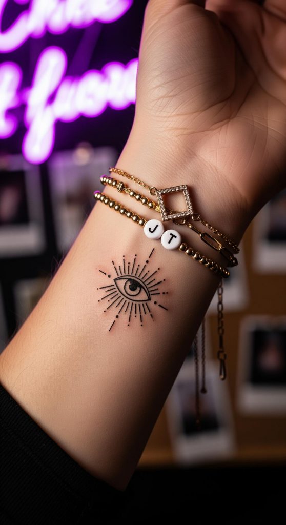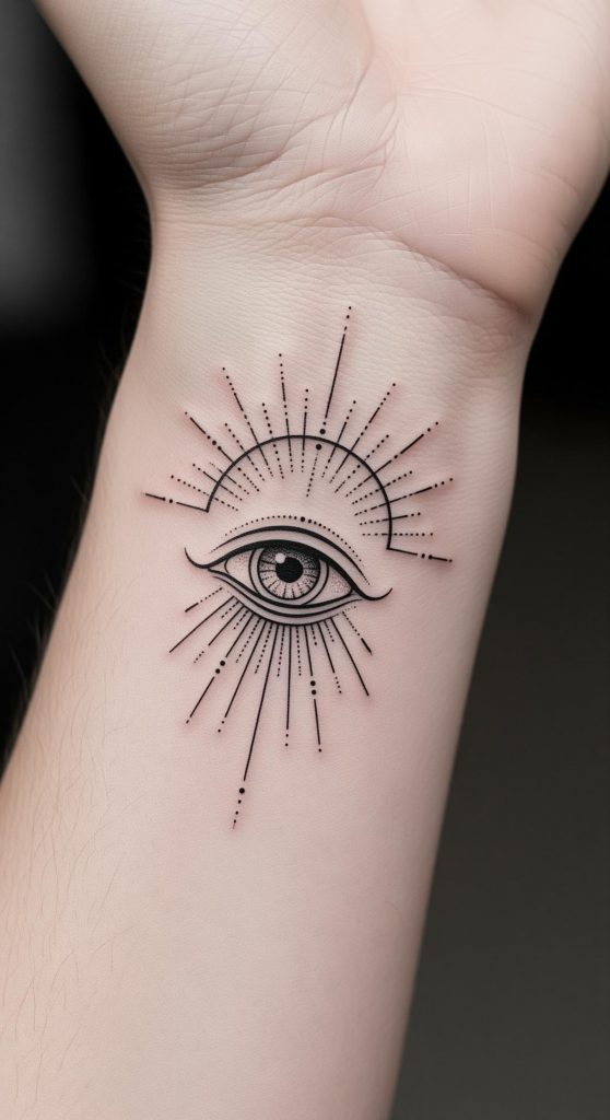 Paired with radiant lines echoing sunlight, the design channels optimism and the empowering light we hold within. Tailored for women seeking an elegant mark of individuality, this tattoo celebrates creativity, intuition, and personal transformation in an understated yet meaningful way.