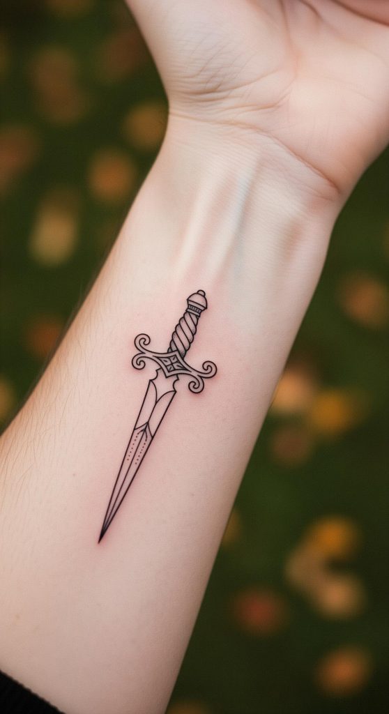 This graceful, finely-lined sword tattoo carries layers of meaning, symbolizing inner strength, resilience, and clarity of purpose. Historically, the sword has represented not only valor and protection but also the wisdom required to discern when to wield power delicately.
